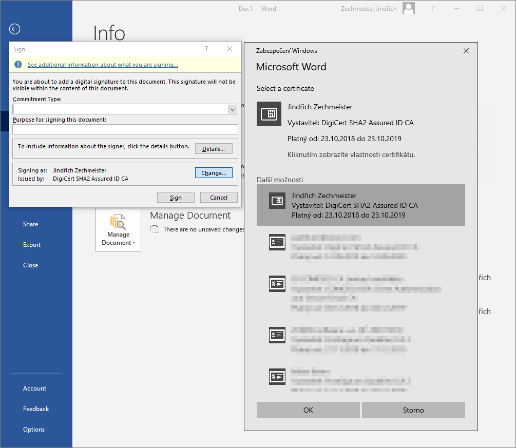 Once the certificate order has been completed, you will receive a token from DigiCert and start using it. In the office program, where you create the document, find the digital signature dialog and confirm it. You can immediately send the newly signed document to the recipient and he will know who he comes from and has not been changed since he was signed.